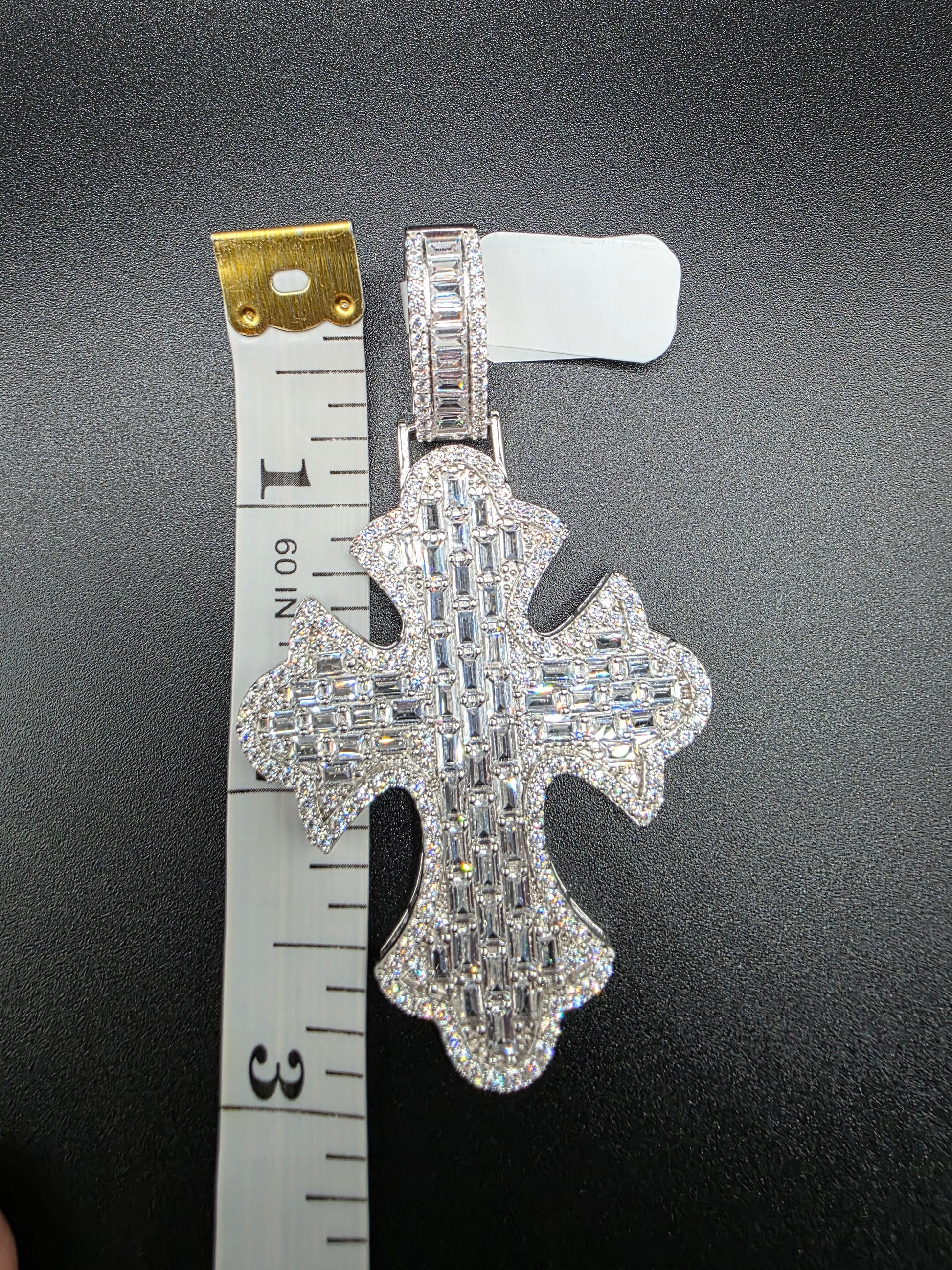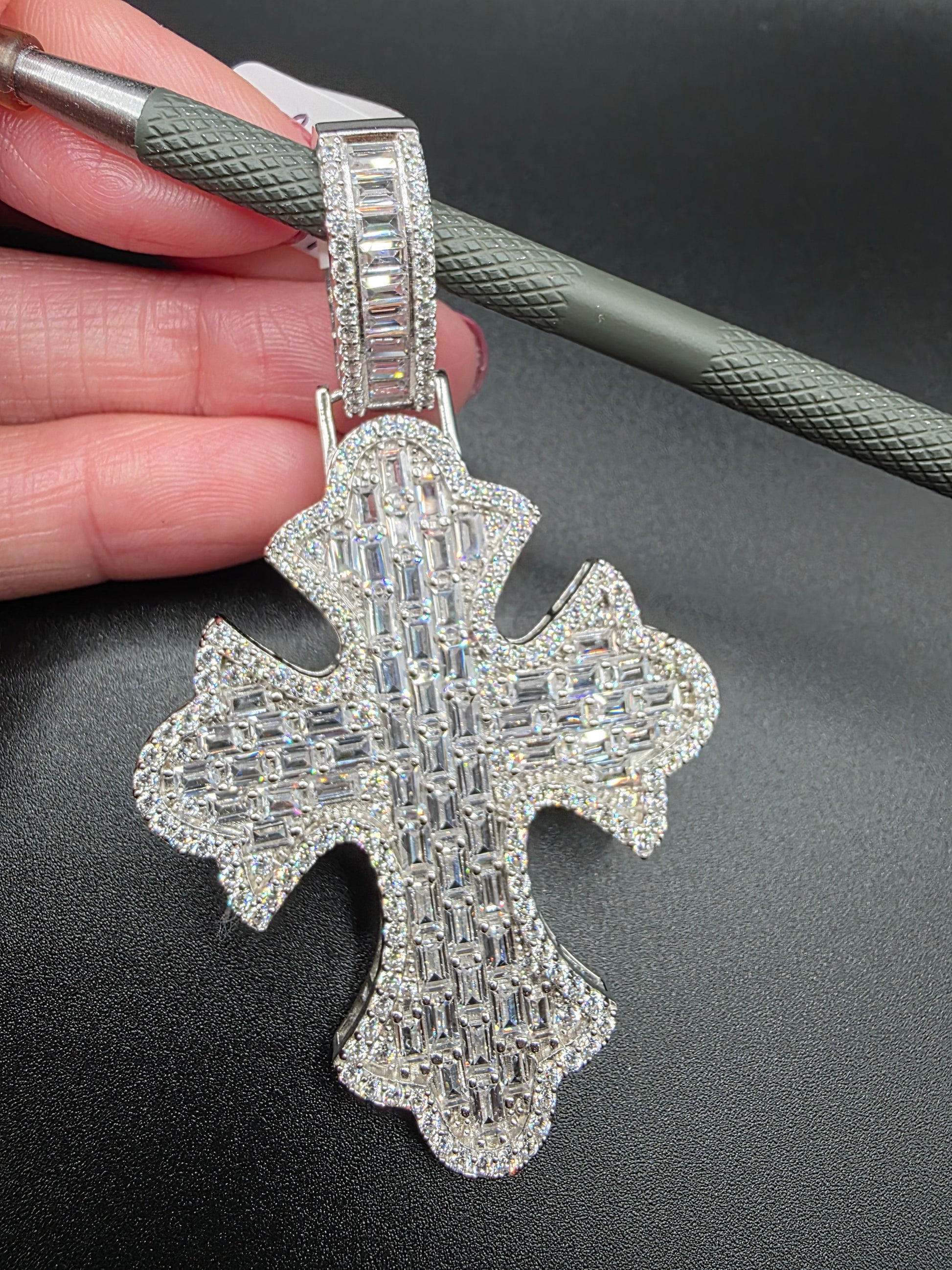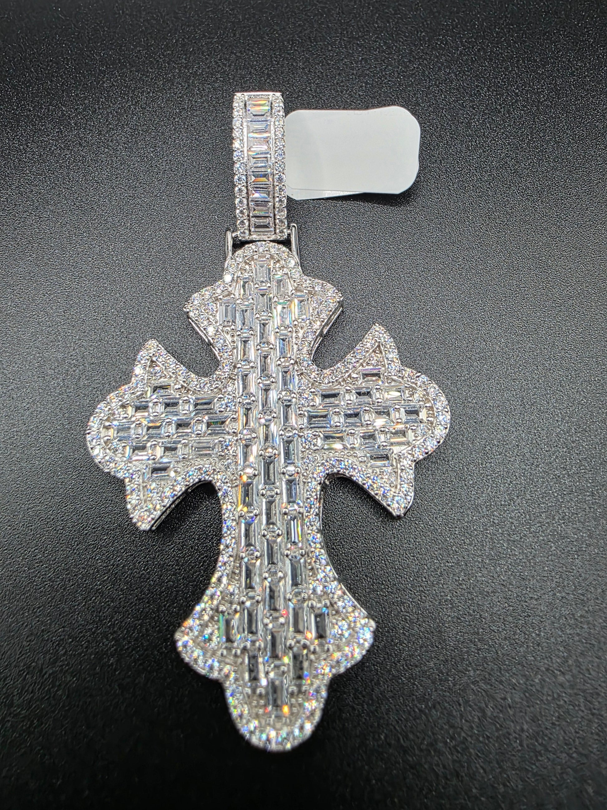 925 Sterling Silver 52.6mm Fleur De Lis Cross Baguette Cut Clear CZ Pendant