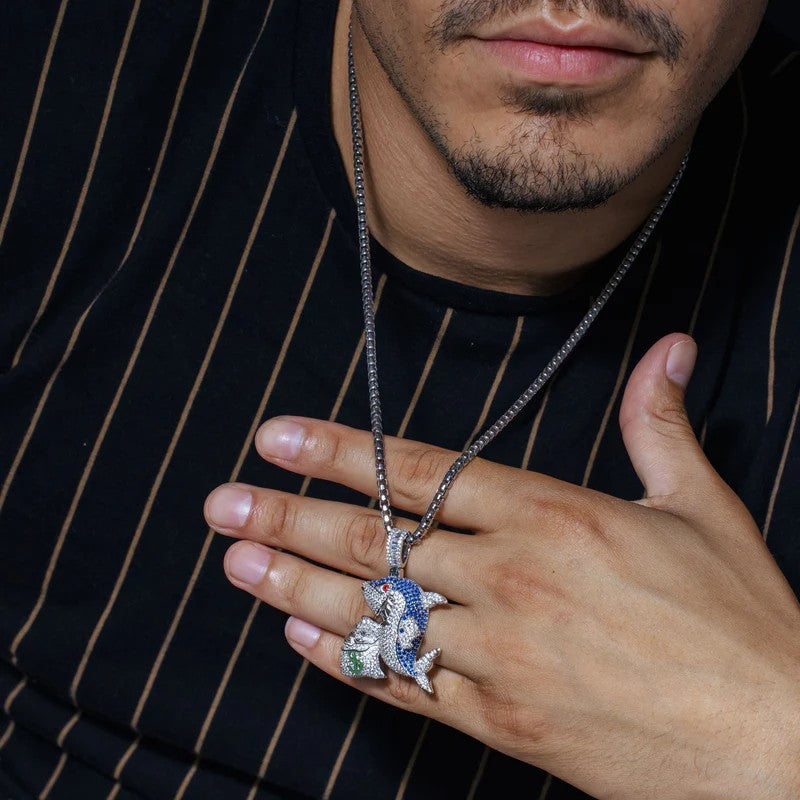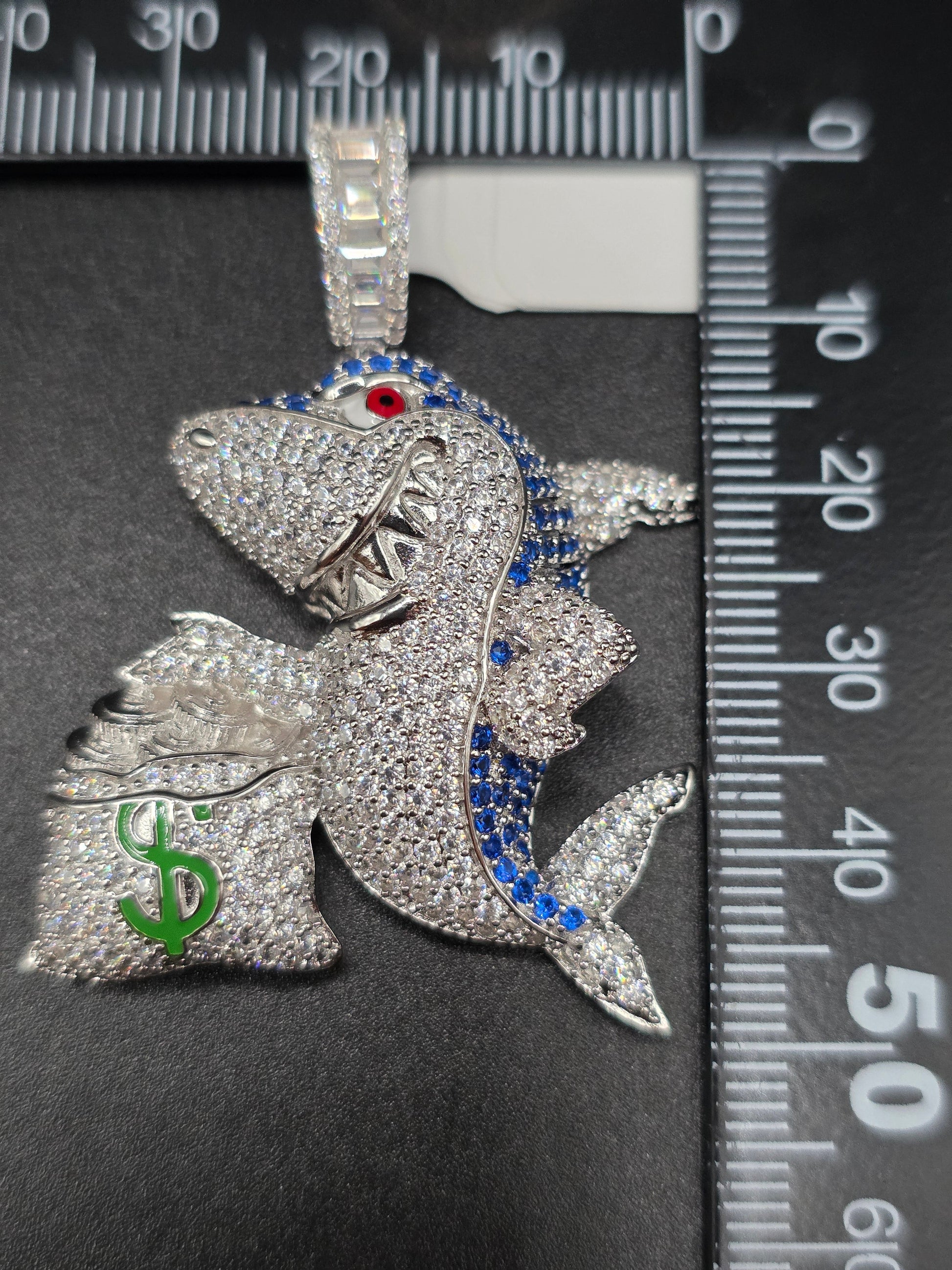 This striking pendant combines luxury craftsmanship with bold symbolism. Forged from 925 sterling silver and rhodium-plated for lasting brilliance, it features an intricately detailed shark design symbolizing ambition and power. The piece is enhanced with sparkling clear and blue cubic zirconia stones that catch light beautifully, creating dimension and sophistication. The money bag motif adds contemporary edge, making this pendant ideal for those who appreciate fine jewelry with personality. A versatile statement piece that elevates any collection.
